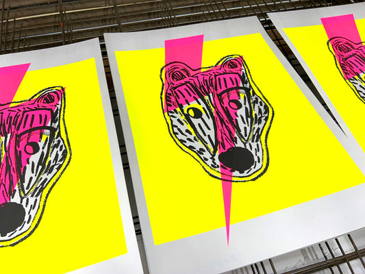 For this initial collection for Aunt Joy, Kelda chooses to mix screenprint with abstracted paint. She scrapes and stamps colour across the surface using a print squeegee. These artworks are spontaneous yet maintain balance and composition. The result is a striking, built-up textured artwork, where all layers are visible.